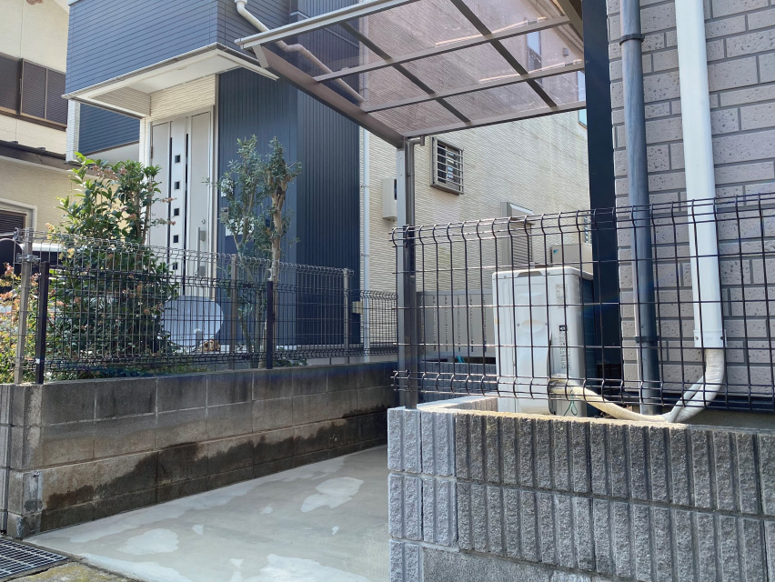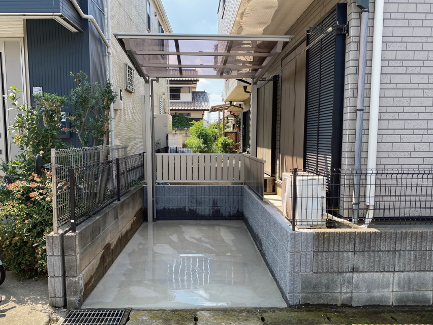 自転車がご趣味のお客さま。大切な自転車を駐輪するスペースが無いというお困りごとに対し、お庭の一部を屋根付サイクルポートへプランニング提案。リビング前への配置なので、室内からの視線を意識した高さや自然光を遮らない天井がポイントです。お庭スペースを確保しながら実用性も兼ね備えた提案にご満足いただきました。