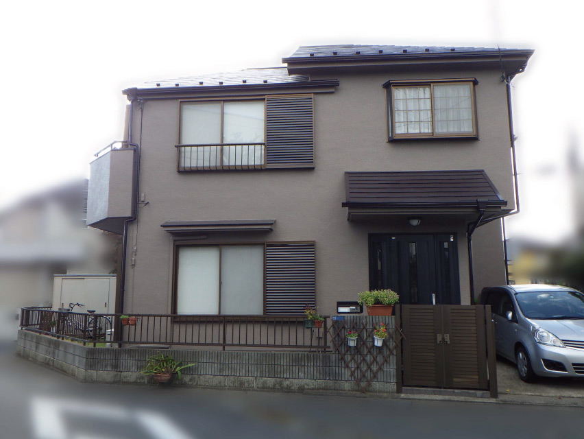 外壁膨れやひび割れ箇所などは丁寧に補修した後、補修跡がわからなくなるように元のテクスチャに合わせて吹付を行いました。外壁、屋根の色も落ち着いた飽きることのない色に仕上がりました。