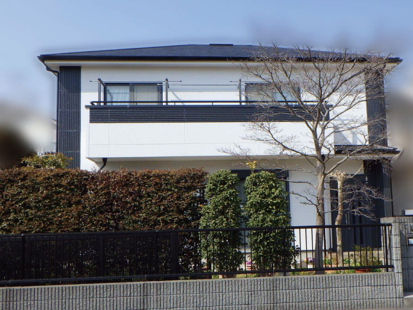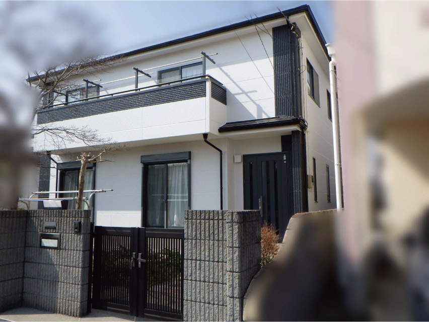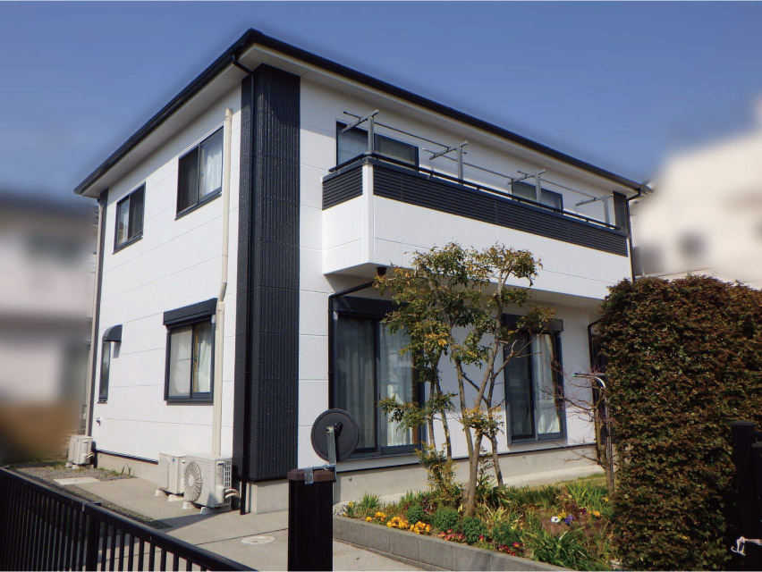 外壁アクセント部と付帯部は黒で統一し、メインの外壁の白色が引き立ち存在感のある家になりました。
