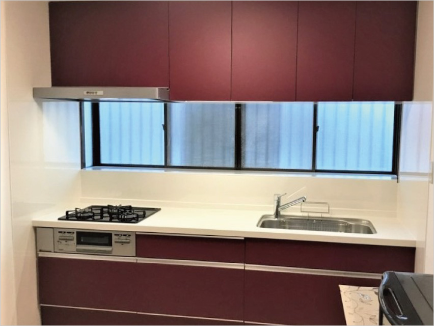 落ち着いた赤い色の扉がキッチンの室内をフレッシュな印象にまとまりました。機能面で使いやすくなったガスコンロやレンジフードは掃除もしやすくなったのでお喜びいただけました。室内の壁紙や床のクッションフロアも新しく交換し、リフォーム工事の満足度を高めていただきました。