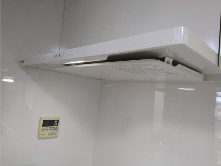 レンジフードと吊戸棚を同じ高さに揃えてスッキリとした印...