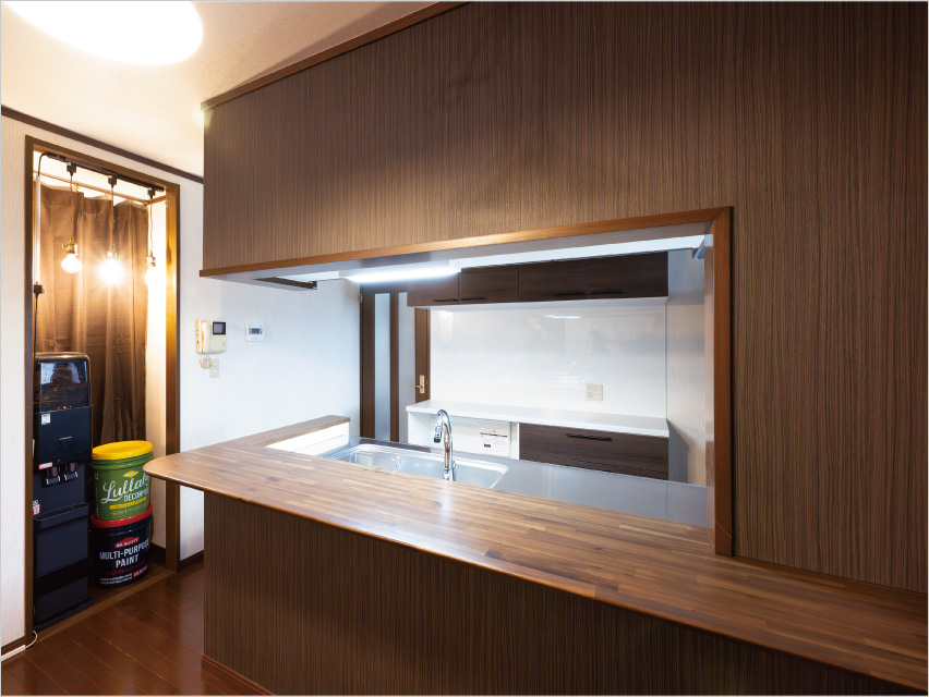 エコキュートの交換の相談から浴室、洗面所、キッチンの交換に発展。バスルームは癒しの空間に、キッチンは木目調に統一され、こだわりの間接照明、インテリアと調和しステンレスワークトップが光り輝く、暖かみのある空間に変身。