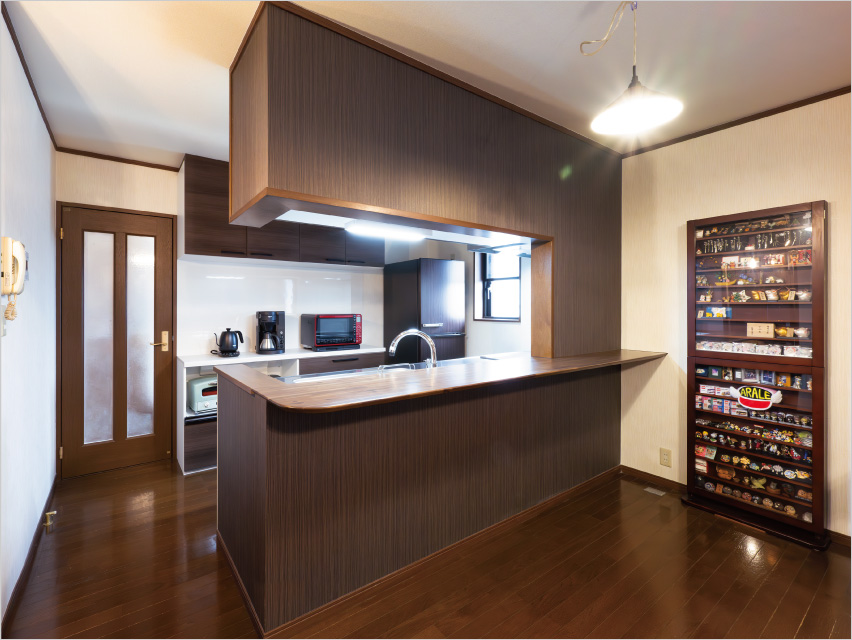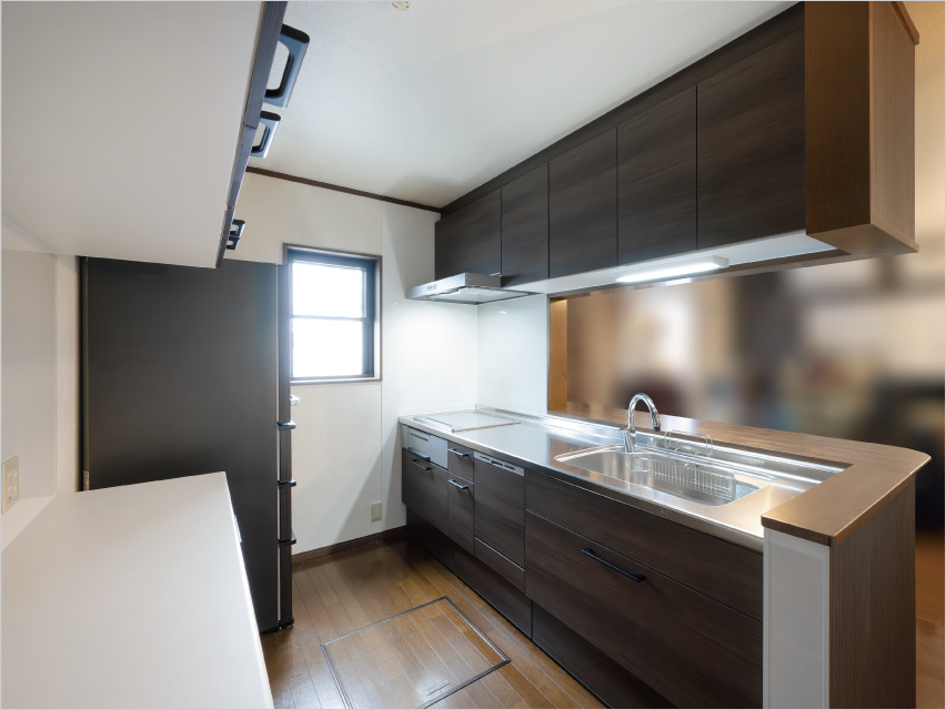 ダークな色調にリフォームし高級感のあるキッチンに