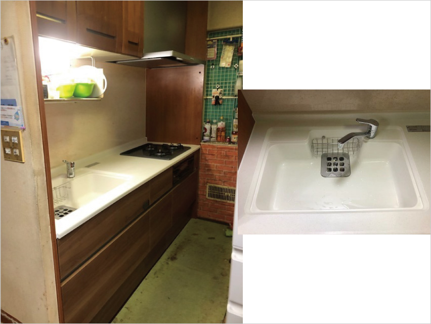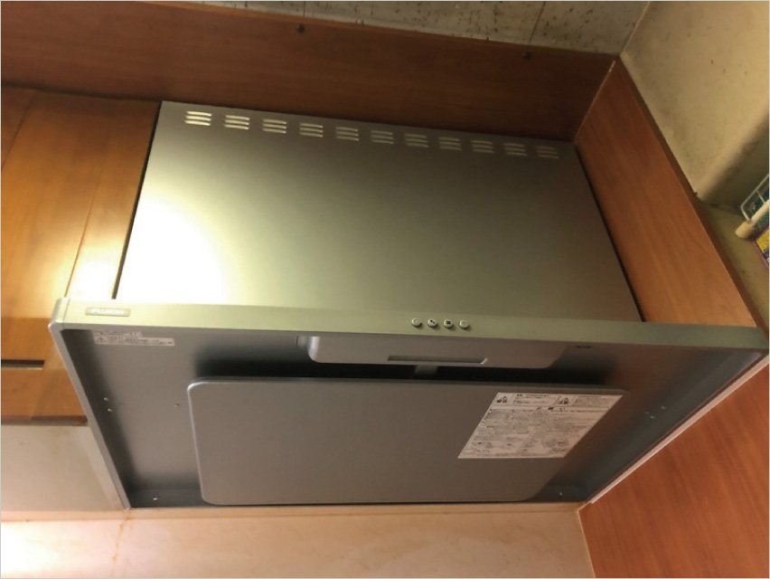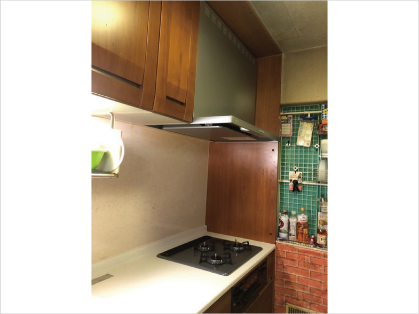 上部吊戸棚に不都合な部分はなく、コスト削減のため再利用を行いました。長年使用しているレンジフードはフィルターの交換が都度必要なため、ノンフィルター式へ交換しました。他にもシンクと天板の隙間への汚れが気になり、クラストンシンクの一体仕上で汚れが溜まらない構造へ変更し、お手入れしやすい仕様へリフォームしました。