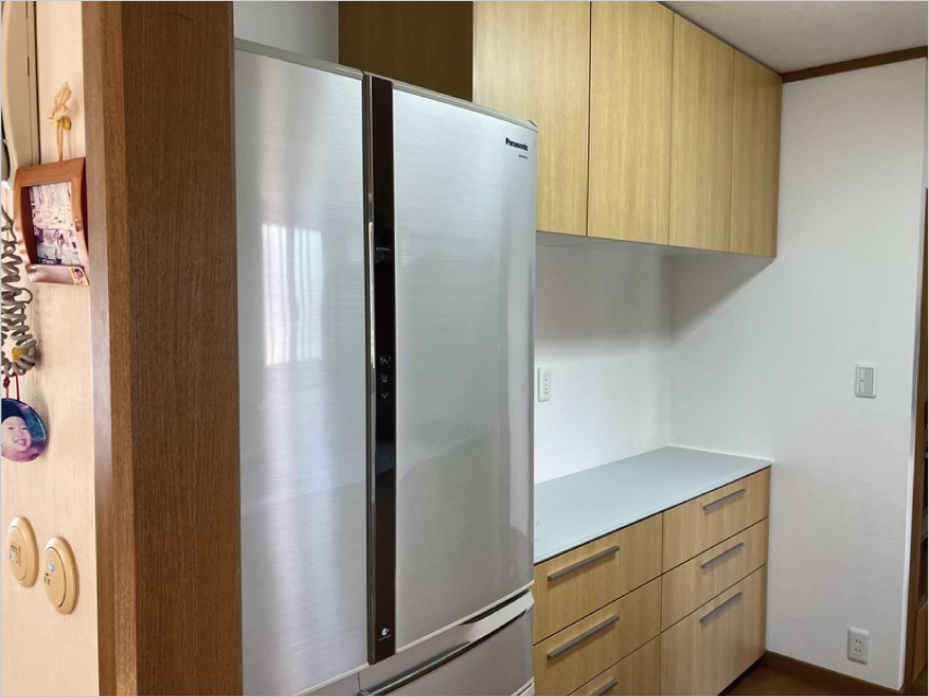 【Hさま邸】ホワイトの人大カウンター・キッチンボードと扉カラーも統一され、ゴミゴミしさが無くなりスッキリしました。