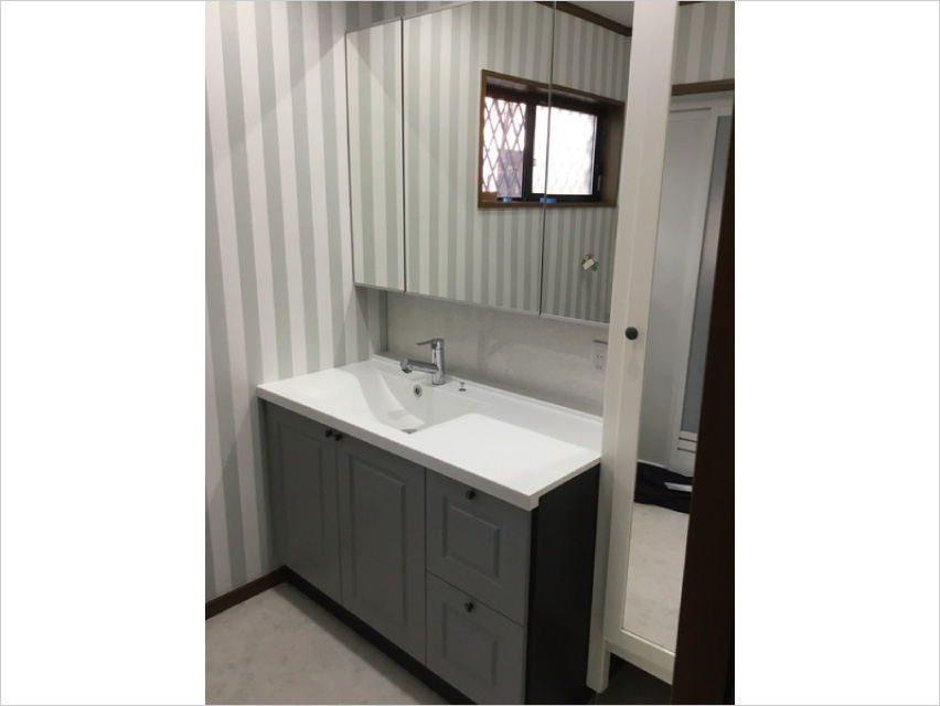 内装にはモダンなストライプ模様の壁紙を使用。水はねの心配がある水栓の後ろ側はキッチンパネルを使用しています。照明にはダウンライトを2カ所に追加したことにより、洗面室全体が明るくなりました。
