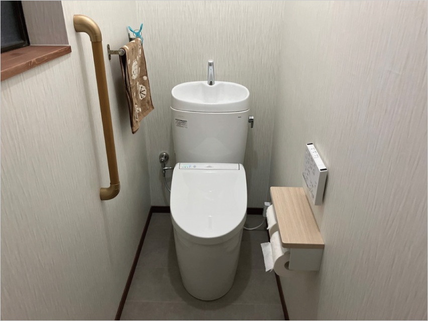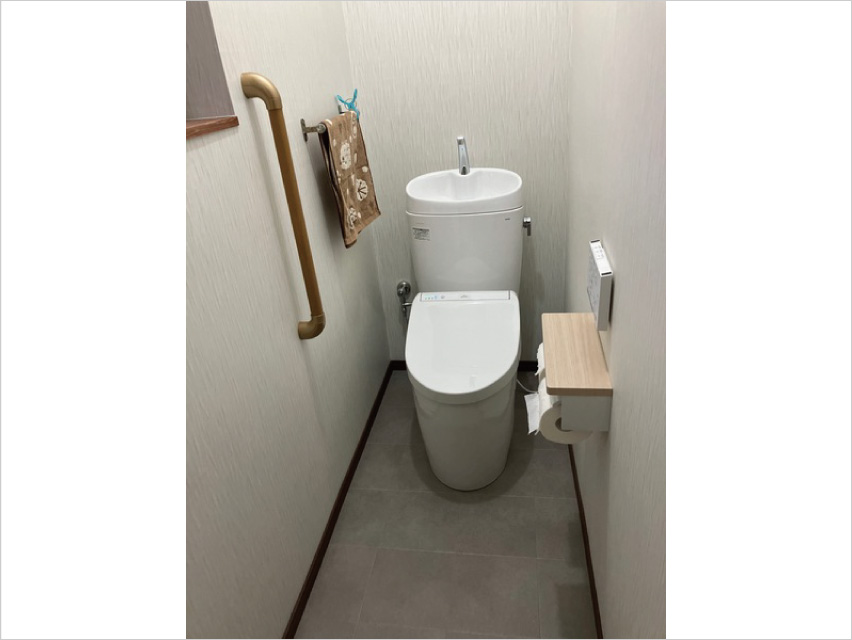 トイレ全体が明るくなり床の段差を解消し大変使いやすくなりました。手すりと二連紙巻器も設置しとても便利で使いやすくなりました。