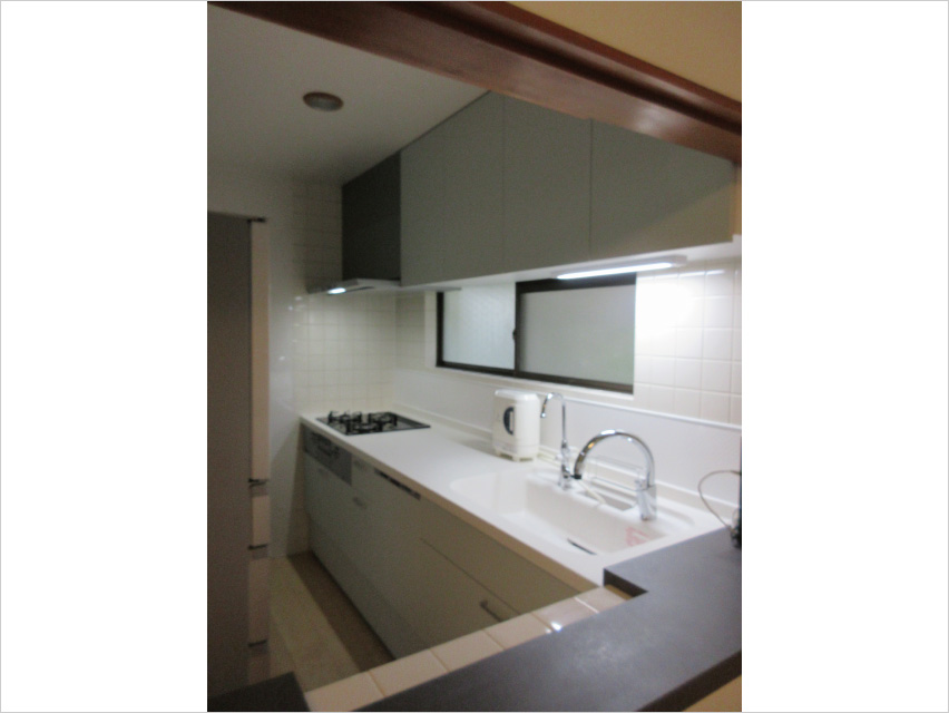 リビングに向けてコンロが設置されていたL型キッチンから、コンロの配置を変更したI型プランに取替ることにより、リビング側に流れていた排気を軽減。使い勝手を考慮して、キッチンの高さや、対面側冷蔵庫とのスペースに収まるよう天板の奥行寸法を検討しました。リビングとの間の腰壁は残すことで、配膳カウンターとしての機能や、飾り物置き場となって使い勝手の良いキッチンに生まれ変わりました。