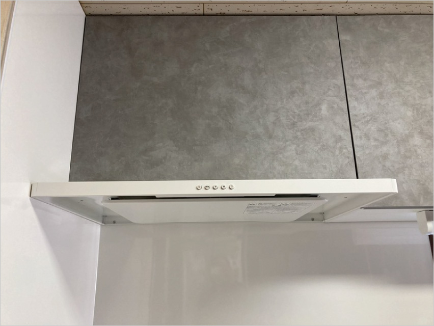 レンジフードと吊戸棚を同じ高さに揃えてスッキリとした印...