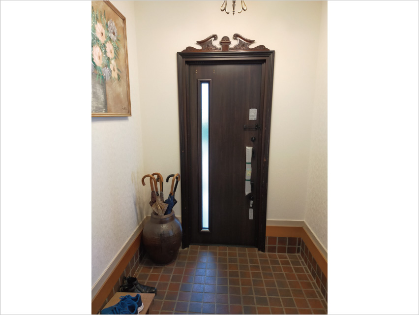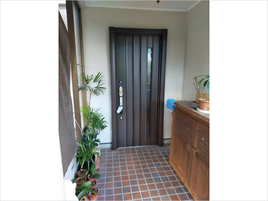 以前より開閉に不具合のあった木製無垢の玄関ドアを交換したいという事で一枚ものの質感を失うことなく、重厚なイメージを引継ぎながら最新のセキュリティと耐久性、断熱性他を持ち合わせたLIXIL(リシェント)へ交換されました。カバー工法で内外部、特に内部額縁の飾りをそのまま生かして交換装着することで違和感なく収める事ができました。