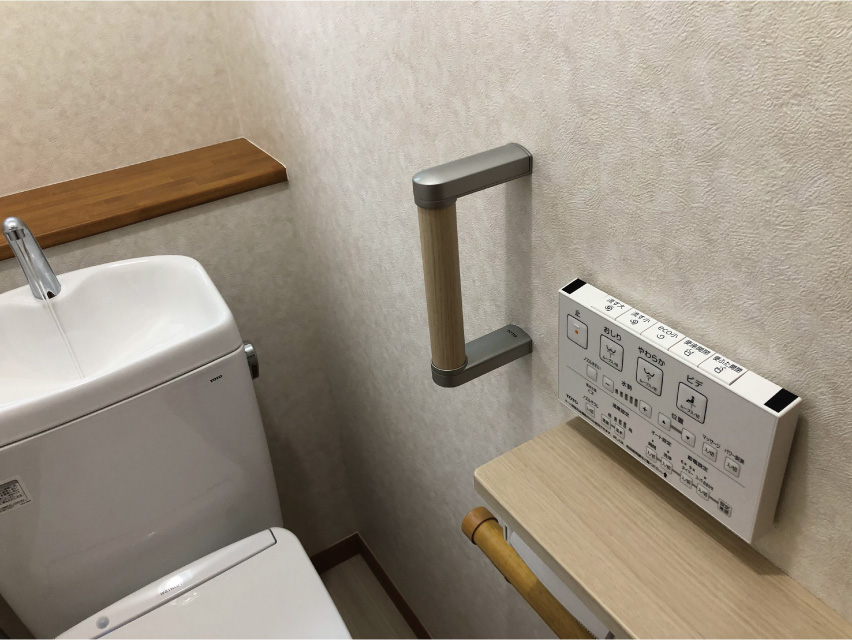 感染症対策として、手を触れずに便蓋の開閉、便器の洗浄が可能なフルオートトイレへ取り替えをした。また、手すりが現状横手すりのみでご不便を感じていたため、縦型のハンドグリップを追加で取付した。内装も貼り替えして、明るい雰囲気のトイレ空間へ仕上げた
