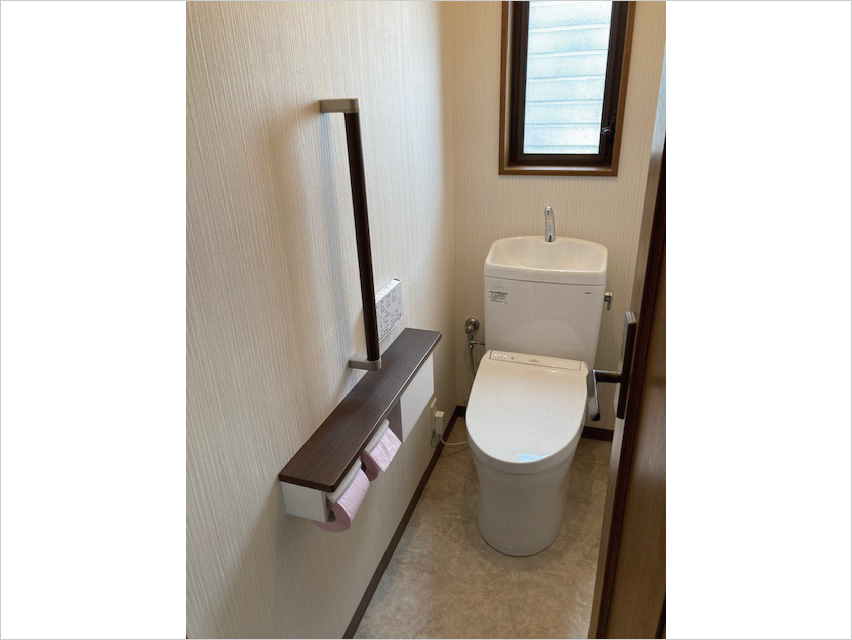縦型の手すりと紙巻器・横型の手すり兼用のカウンターを取付しました。壁の裏は下地補強をし、同時に内装工事も行いました。