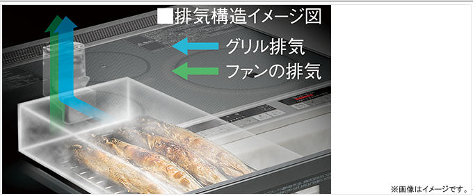 Panasonic独自のグリル排気構成により、煙を後方ではなく、上下へ導くことでキッチン壁面への接触を抑え、汚れを軽減します。