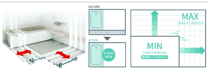 浴室スペースに合わせて、間口・奥行ともに2.5cm刻みでサイズオーダーできます。サイズバリエーションは約1,400、建物本来の浴室スペースを無駄なく使い、今よりも広い浴室を実現します。