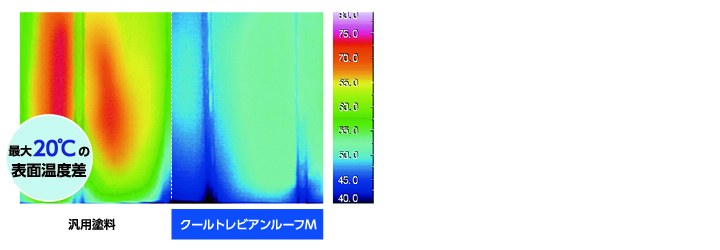 サーモグラフィー(熱画像)による温度比較特殊顔料を使用する遮熱塗料は、太陽光の中でも放射熱エネルギーの強い近赤外線領域の光線を効率的に反射。表面温度の上昇を抑制します。