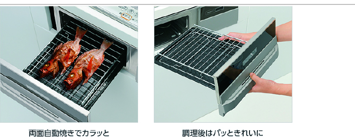 水はり不要の両面自動焼きグリルで、美味しい焼き魚が手間いらず。