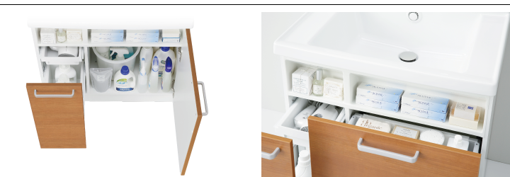 ボウル下のデッドスペースを収納スペースにしました。コンタクト用品などの小物のストック品がすぐに取り出せます。