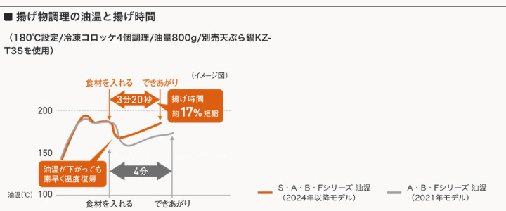 揚げ物における制御プログラムが進化。食材を入れた後の素早い温度復帰で、短時間でカラッとした出来栄えに。